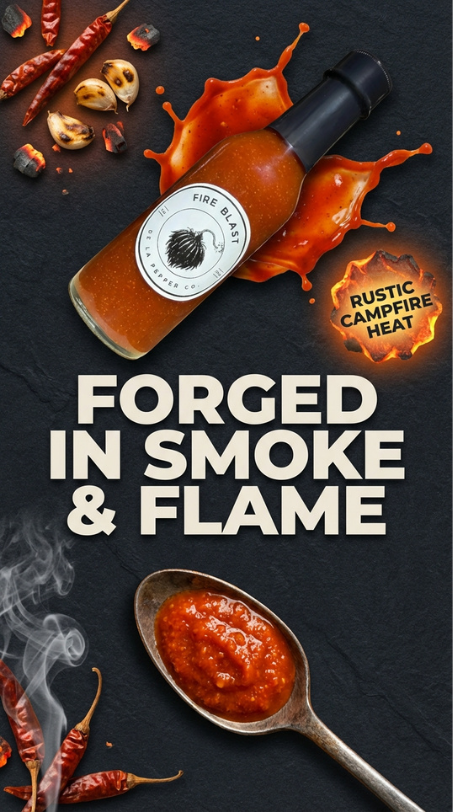 Forged in smoke and flame, Fire Blast blends chile de árbol heat with fire-roasted garlic and a touch of honey. Smoky up front, bold and fiery on the finish, the sweetness sharpens the burn without cooling it. Perfect for those who crave rustic, campfire-style heat.